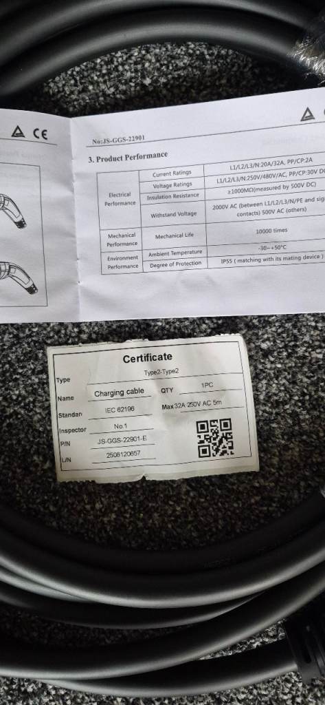 This charging lead for untethered charging points is 32A rated. Unused as I already have one from previous car. Whilst it is MG badged it will work on any Type 2 charging point on other makes of EV. collection preferred but can be couriered at buyer's cost