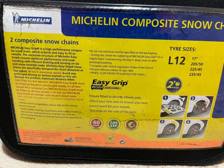 New unused pair of Michelin Easy Grip Composite snow chains for 17" wheels.