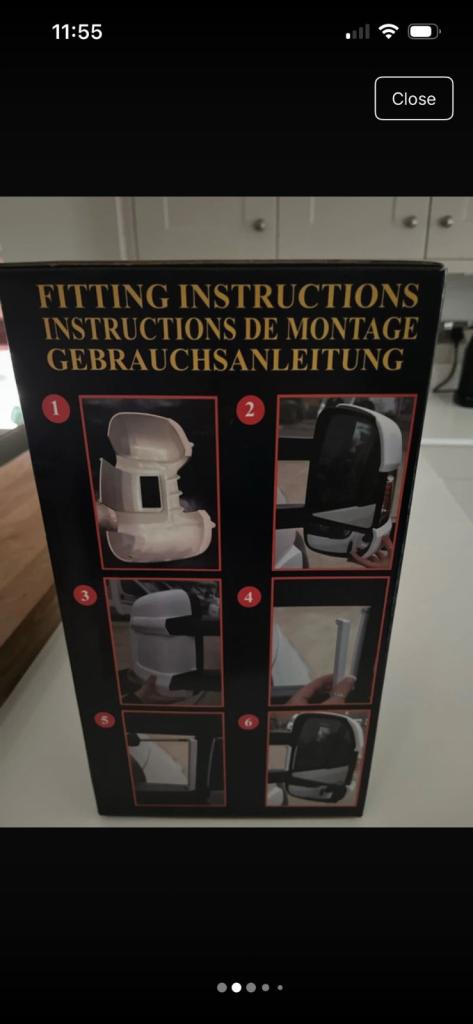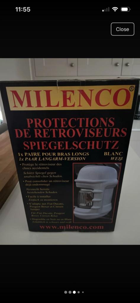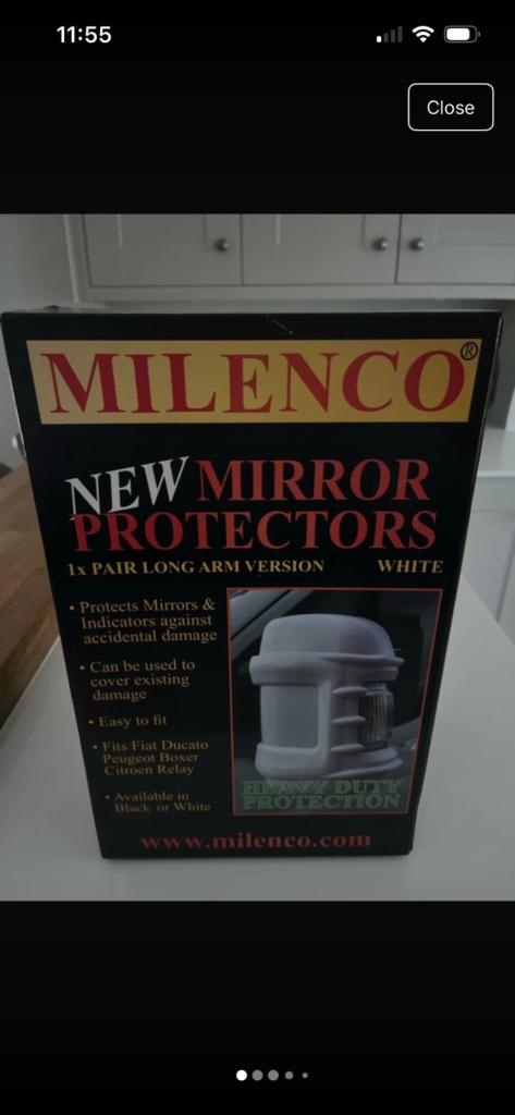 White Milenco motorhome long arm mirror protectors. As new condition, boxed only used for a couple of months. Suitable for Peugeot boxer type cab.