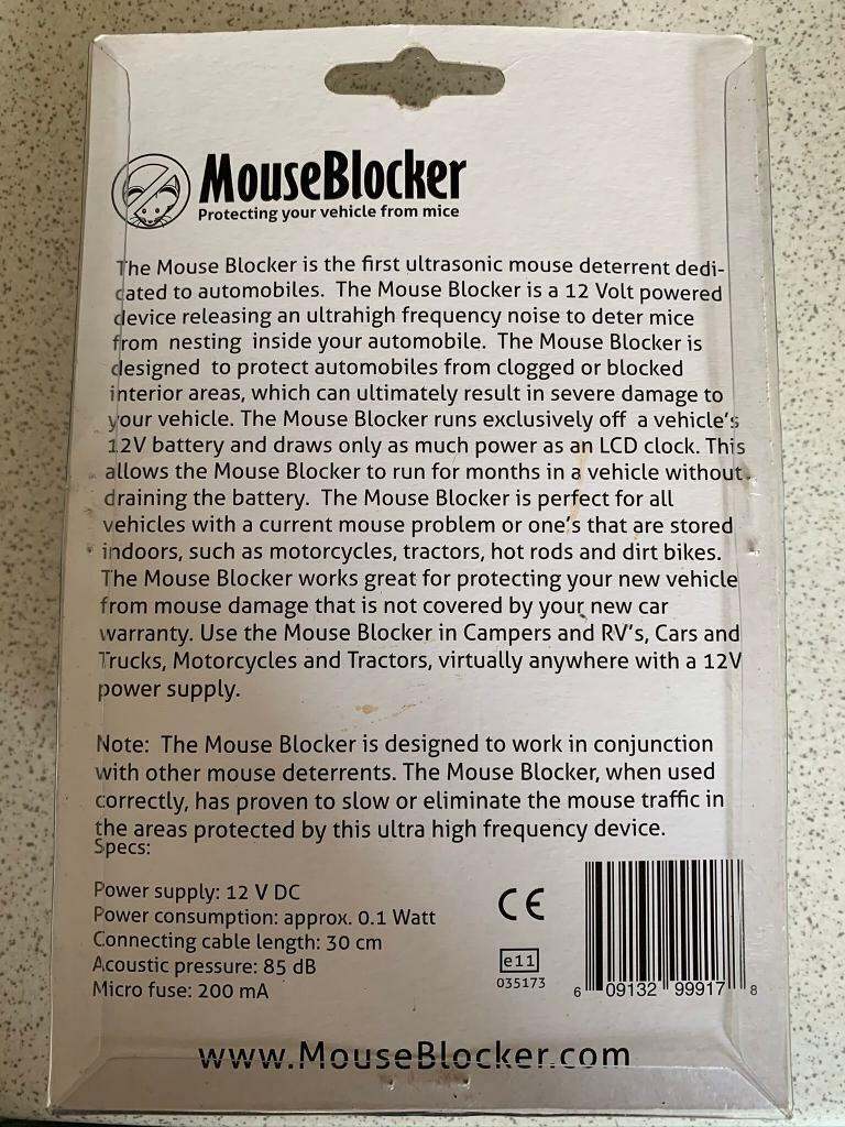 I have a mouse blocker that I bought no longer needed ideal for car,motorcycle,caravan,motor home,it sends out a pulse that can not be heard these are selling on the website for 59 dollars 95 which is over £46 l want £15 .