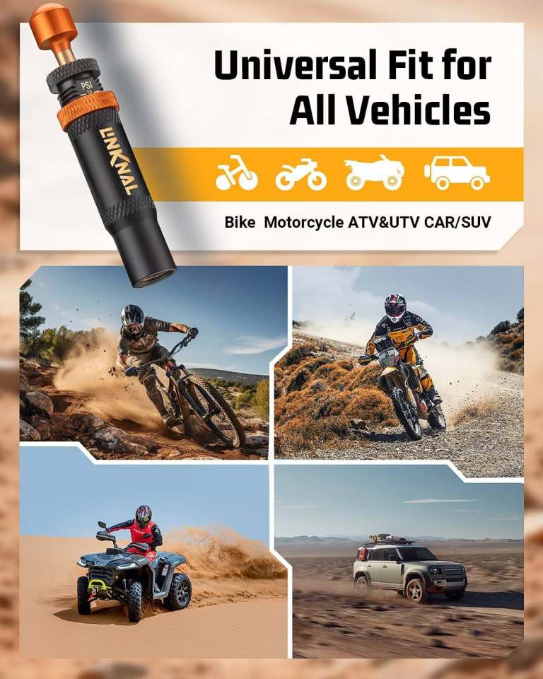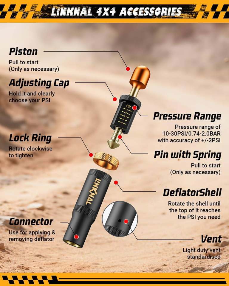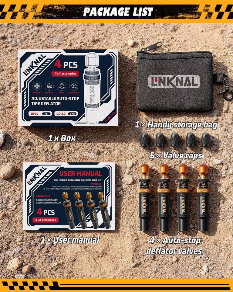 【Four-Tire Sync, 90-Second Rapid Air-Down】Ditch the backache and wait! Simply screw on all four LINKNAL automatic tire deflators at once. They sync to air down yourJeep, Truck, SUV, or ATV tires automatically and precisely to your preset PSI. Walk away to prep your gear and hit theoff-roadtrails faster.