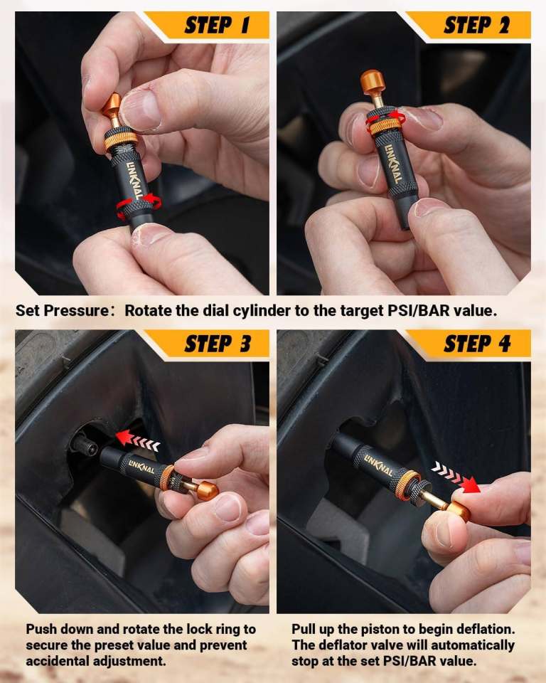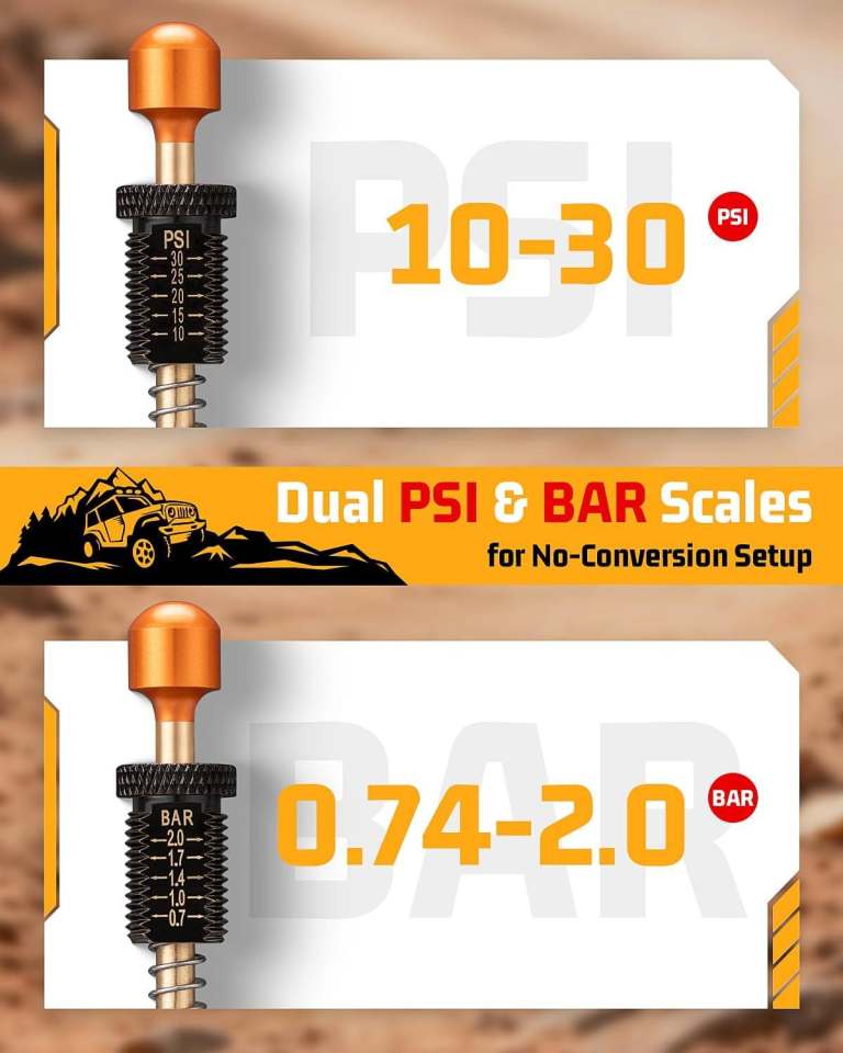 【Set & Forget: Accurate Auto-Stop Deflation】Adjust your desiredtire pressure (10-30 PSI / 0.7-2.0 BAR) effortlessly on the cleardual-scaledial—no tools needed. Each deflator is individually calibrated for reliable accuracy (±2 PSI). It auto-stops at your target, preventing over-deflation for safe off-road adventures.