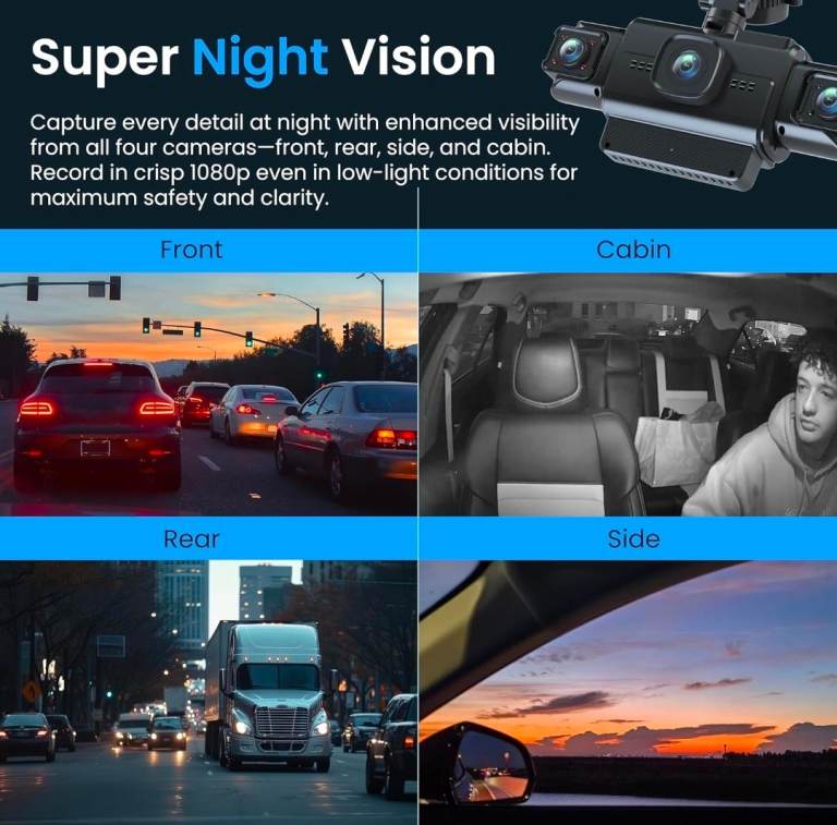 4-Channel Coverage – Record every angle with four cameras covering the front, rear, left, and right. Side cameras can also rotate inward for optional cabin monitoring, each equipped with 4 infrared lights for night clarity.