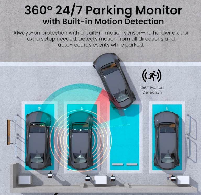 Built-in 360° Motion Parking Monitor – Offers 24/7 protection with an integrated motion sensor—no extra accessories needed. Auto-records on impact or movement when parked.