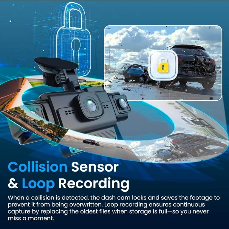 Smart Collision Detection – When impact is detected, the camera locks and saves the event footage separately to avoid overwriting.