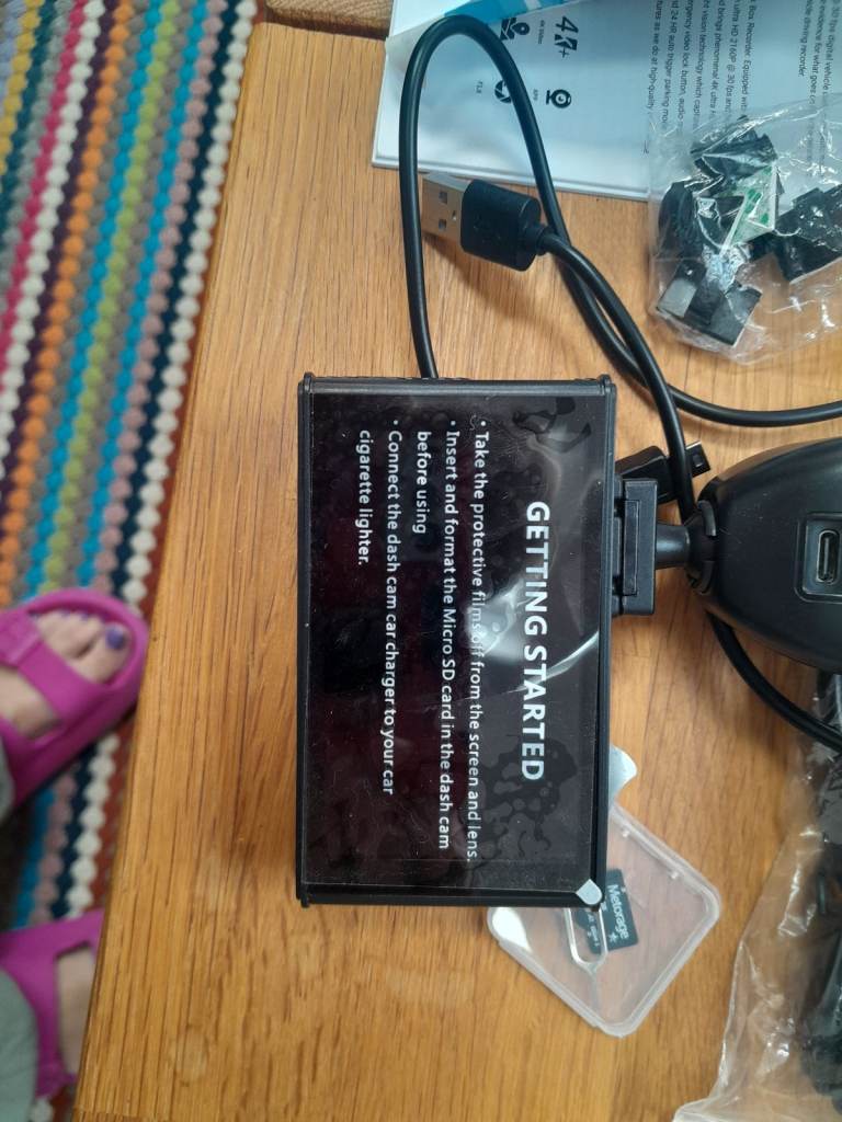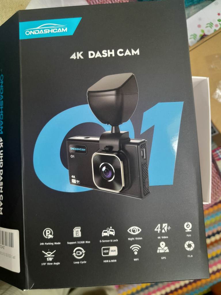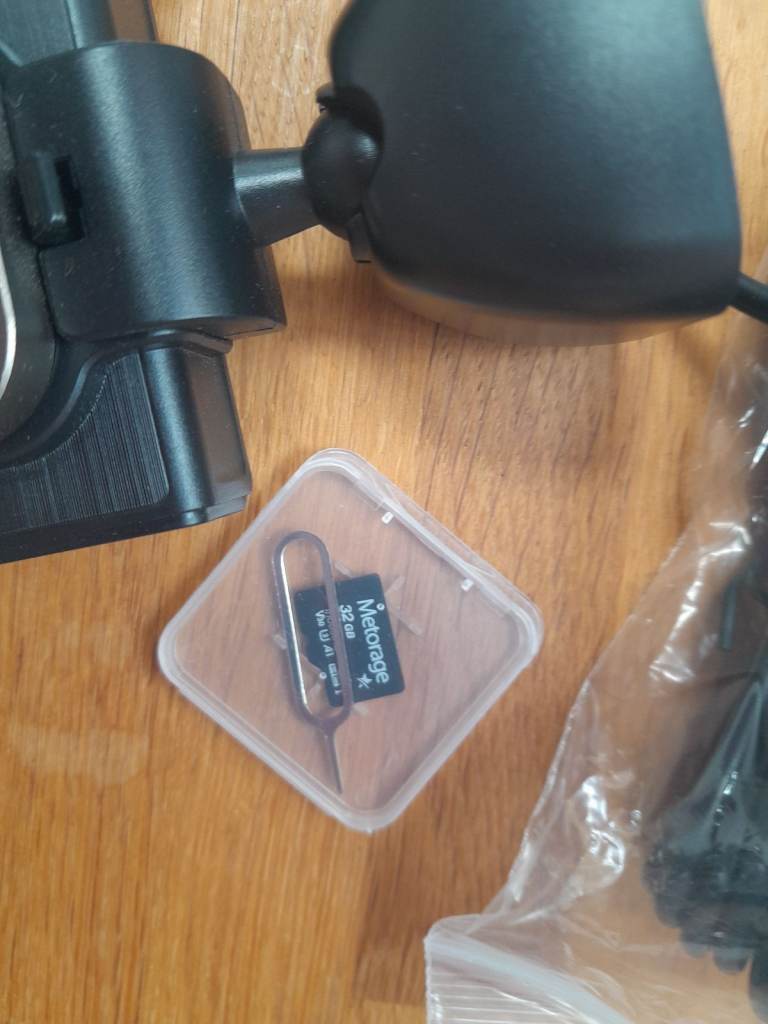 4k UHD dash cam, comes with all connections, SD card, instructions. 3years old. Sorry missing double adhesive and the electrostatic film.