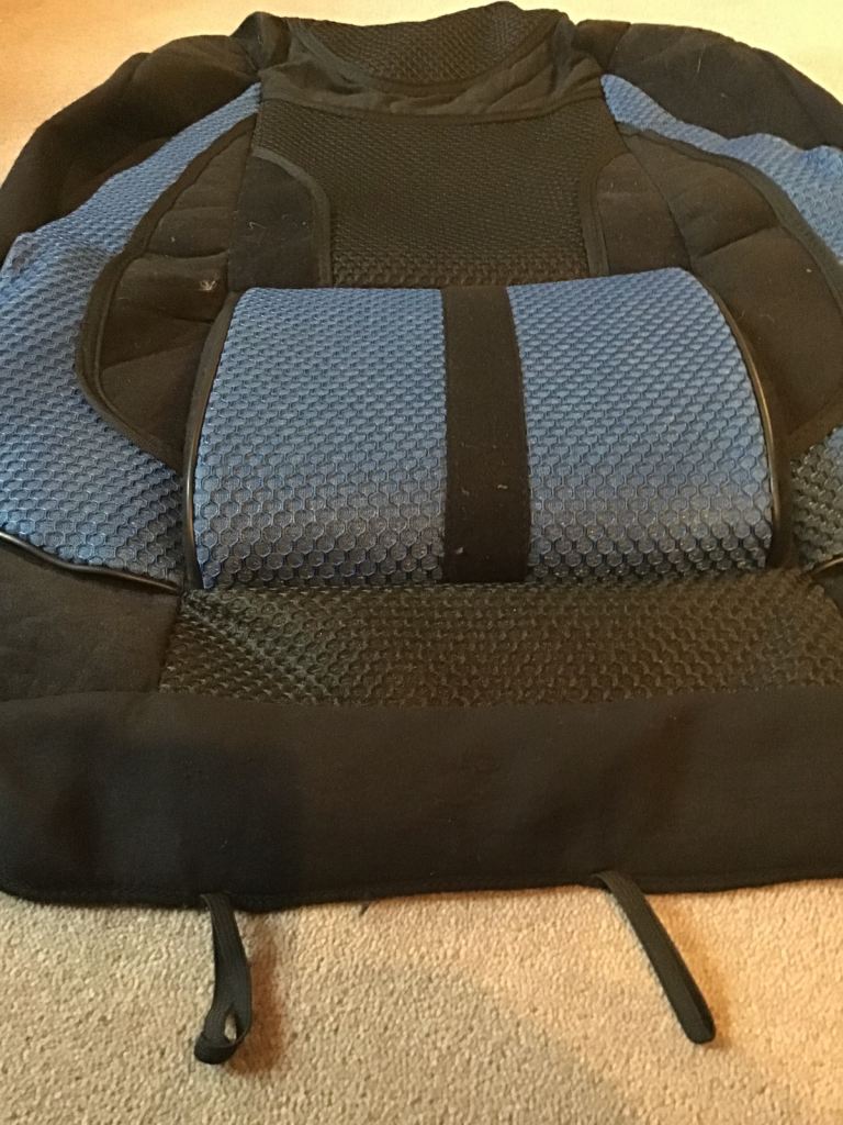 A complete Seat Cover (Head Rest, Back and Seat) strategically padded to give support to back suffers on long car journey. Standard size fitting all Seats. Complete with securing ties. Freshly laundered from a smoke and pet free household.