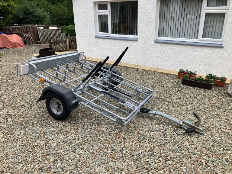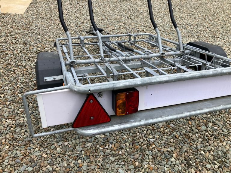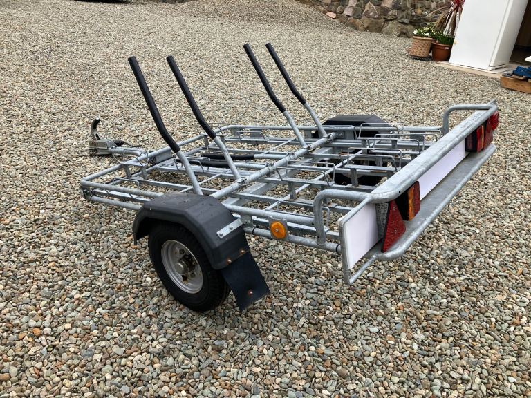 2 wheeled galvanised steel trailer, carriers up to 6 bicycles. Full lights / electrics. Very light occasional use. Stored in garage. Can be collected from Lochgilphead or Glasgow.