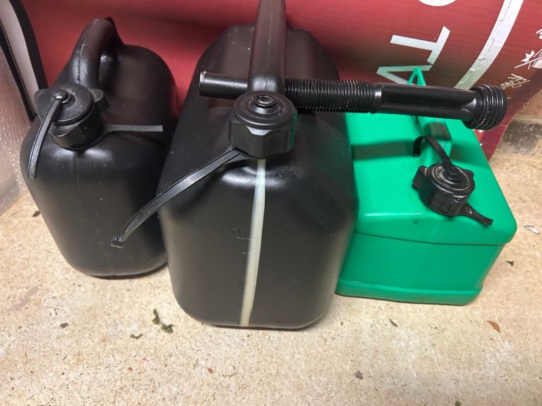 2 x 5 litre and 1 x 10 litre plastic petrol cans. Pre owned but in good clean condition.