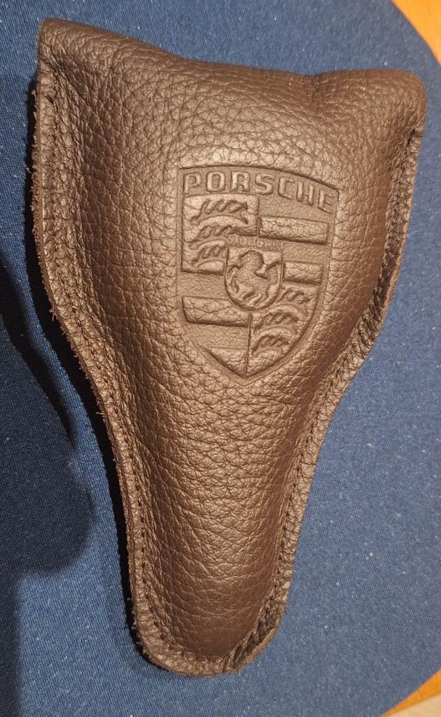 Porsche Classic tyre pressure gauge in a genuine leather pouch.