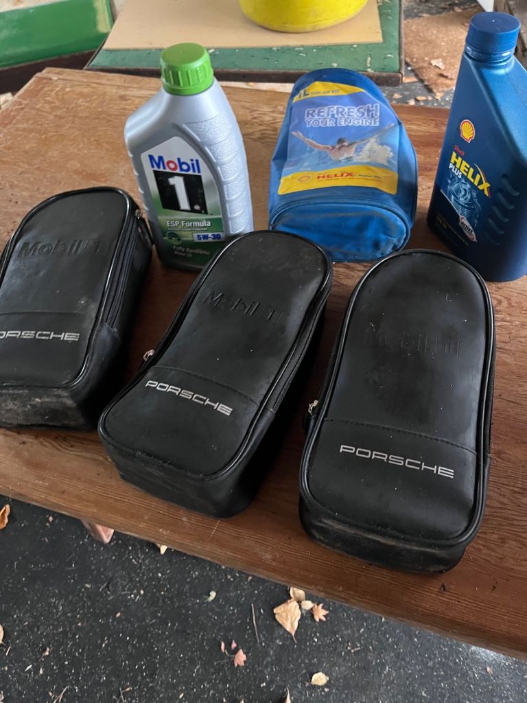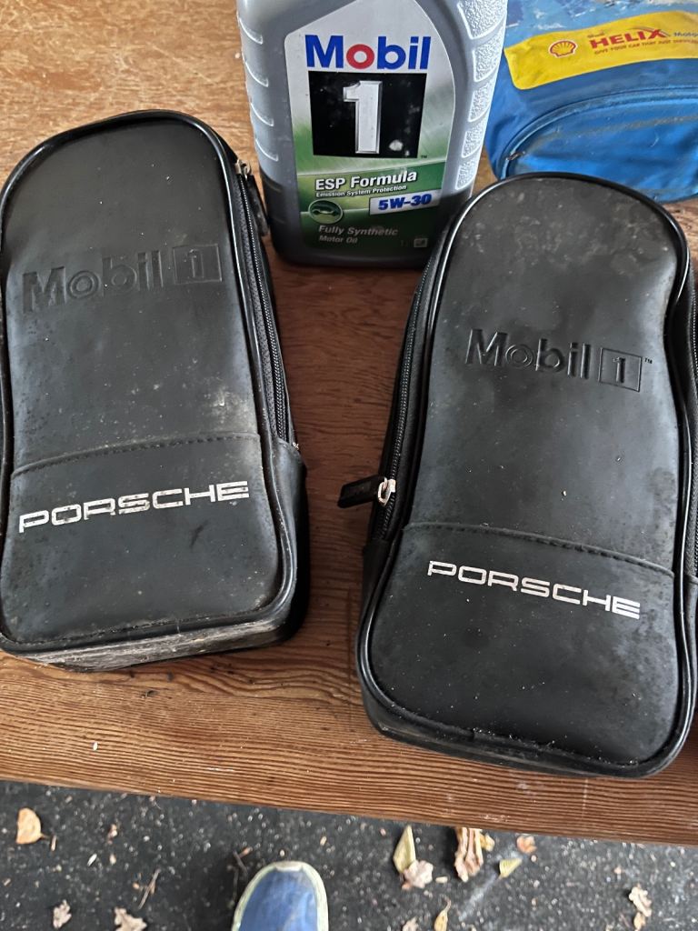 3 x genuine Porsche wallets containing 1 L Mobil 5w 30 engine oil