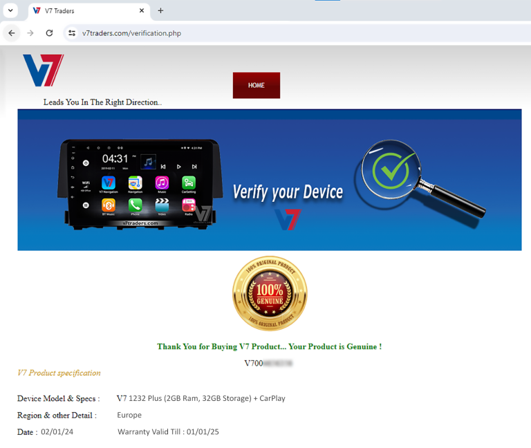 V7 Device Authenticity can be checked through V7 website by inserting its unique serial number.