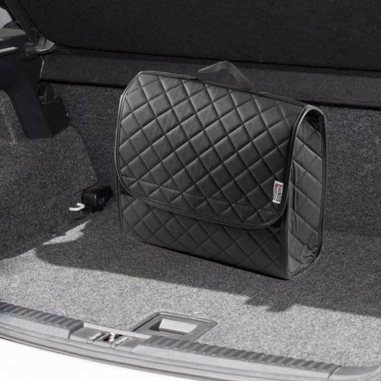 RHINO AUTOSTYLING BOOT TIDY ORGANISER COMPACT STORAGE CAR TRUNK ANTI SLIP BOOT BAG BLACK SQUARE QUILTER LEATHER. Car Boot Trunk Tidy Organiser Bag, Size: 36.5cm x 14cm x 30cm. Fittings On the bottom and on the back side is sewn Velcro, this helps the bag to be easily secured to the carpet, the walls or the bottom of the trunk. This will keep it from moving around. Designed to collect all car accessories including emergency items, travel products or general car care items (first aid kit, fire extinguisher, triangle, emergency vest, wrenches, cleaning liquids, air compressors etc.) Keeps Your Vehicle Well Organised, Neat And Clean. This trunk organiser is very useful in saving your precious storage space. Made from top quality material so it's hard wearing, very tough and built to last.