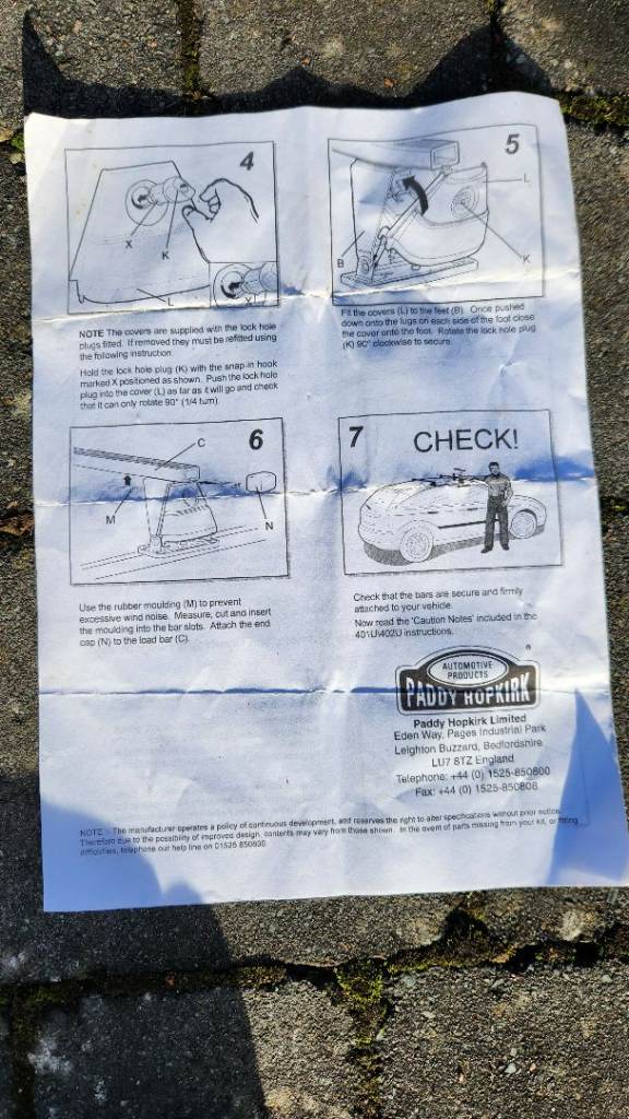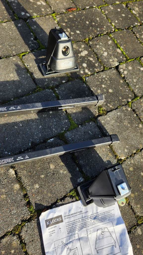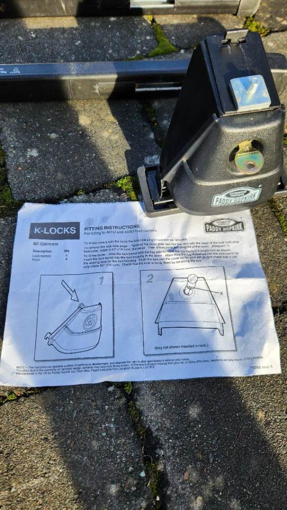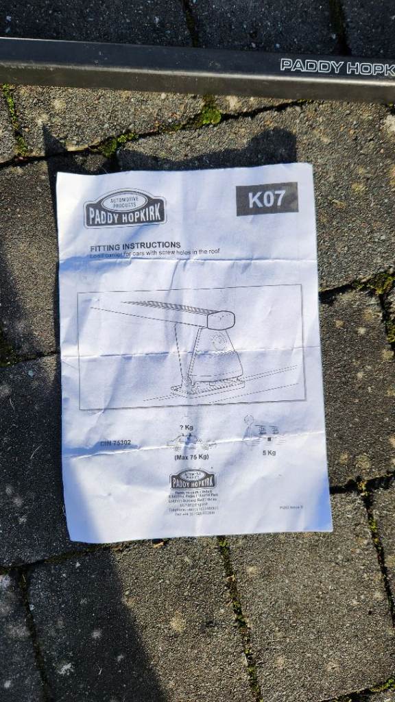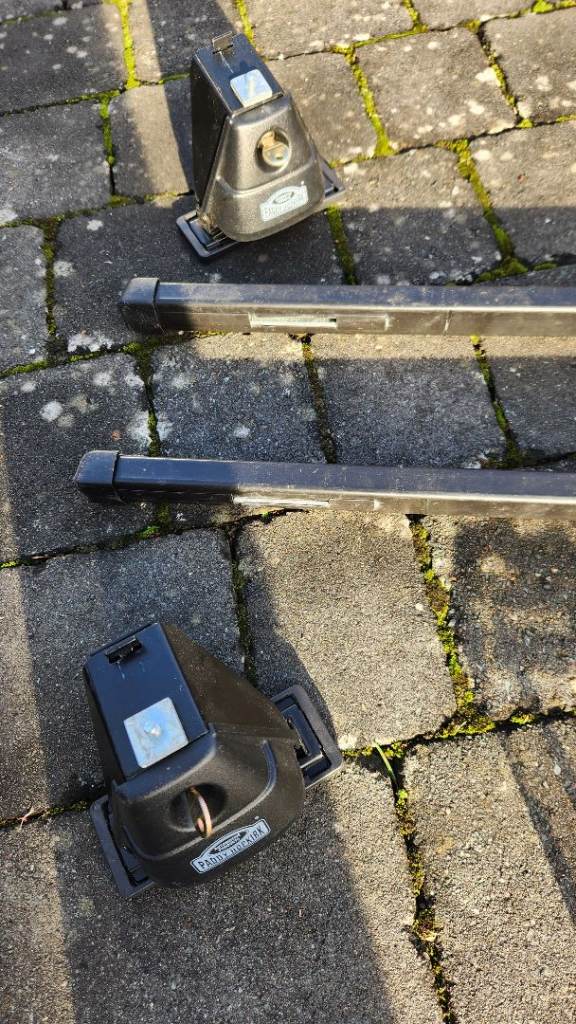 A pair of Paddy Hopkirk roof bars (load carriers) and fixings for mounting a car roof box, etc. They are designed for cars with screw holes in the roof. It is also possible to buy an accessory that allows it to be fitted to cars that only have roof gutters for attachment. All parts are in good condition.
