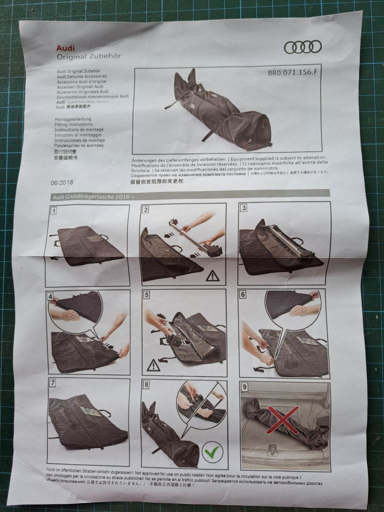 Audi Q5 aluminium roof bars with instructions and storage bag.