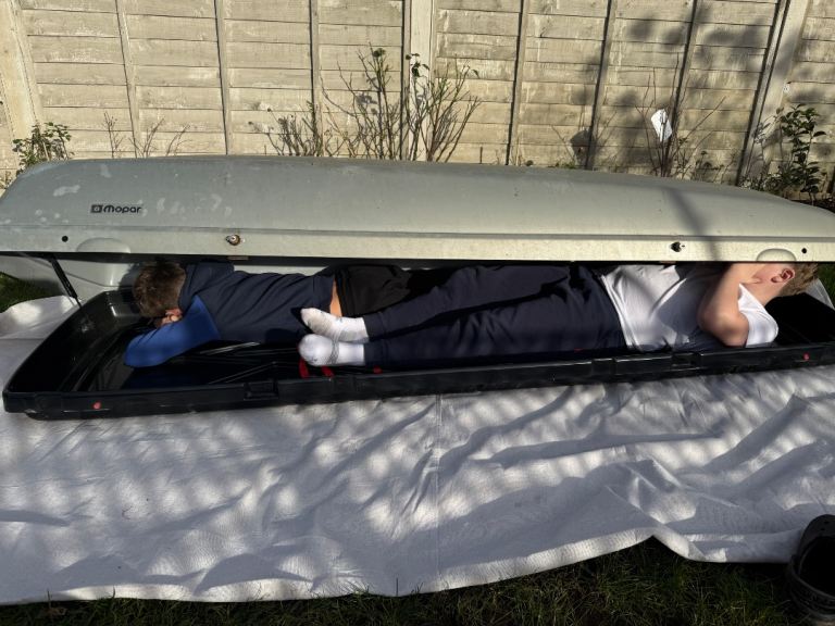 Very big and spacious. Ready to carry two annoying teens or drunk husband. Size: 28”(71)cm) x 90”(225cm)