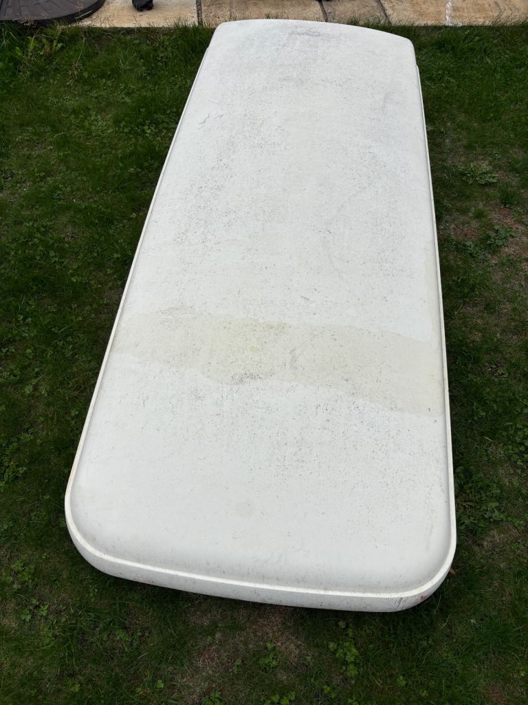 Solid, very large roofbox with key. 225cm x 90cm approx. Not a pretty box but very usable and spacious. Has had lots of use so plenty of marks on it.