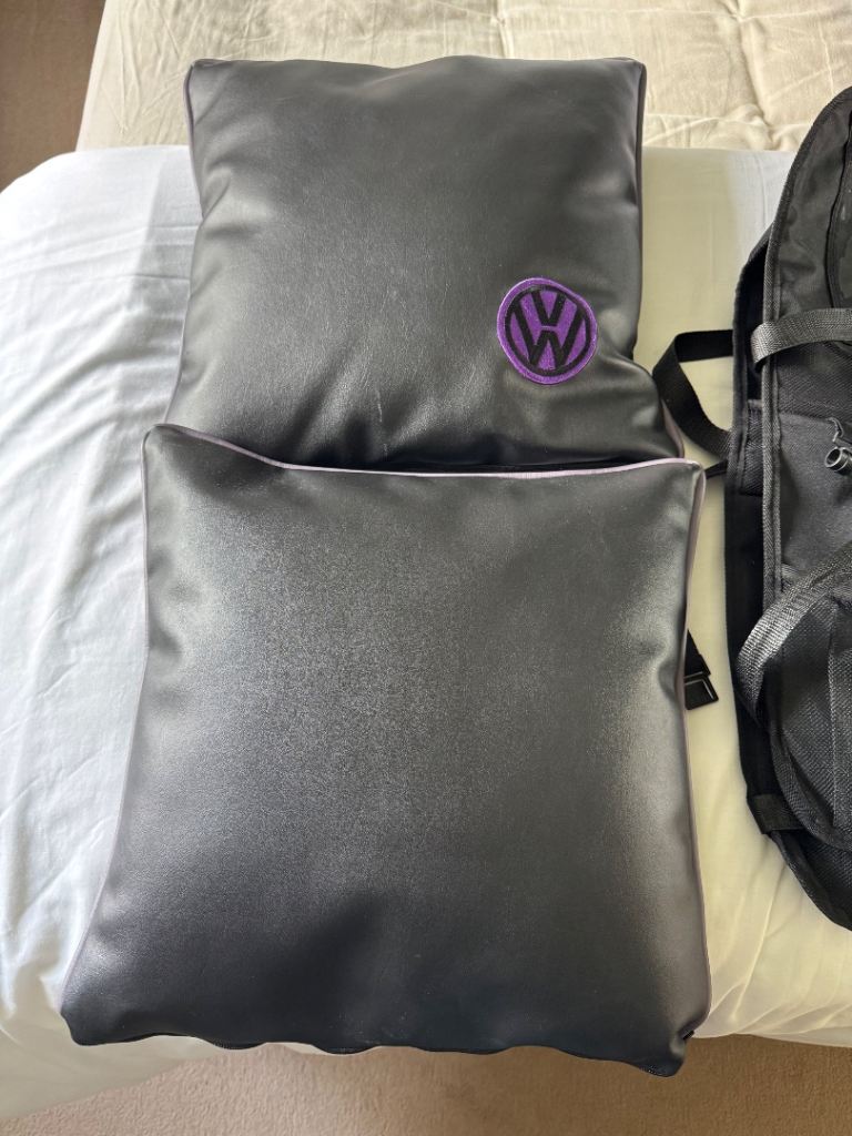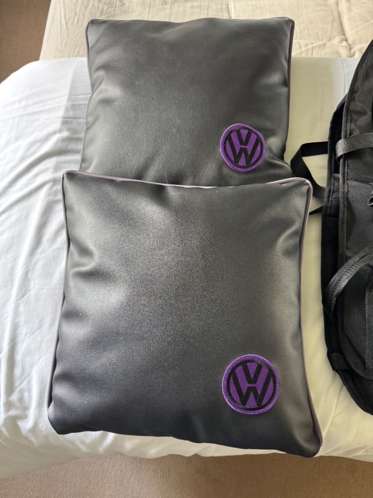 2 black scatter cushions with purple piping & VW logo