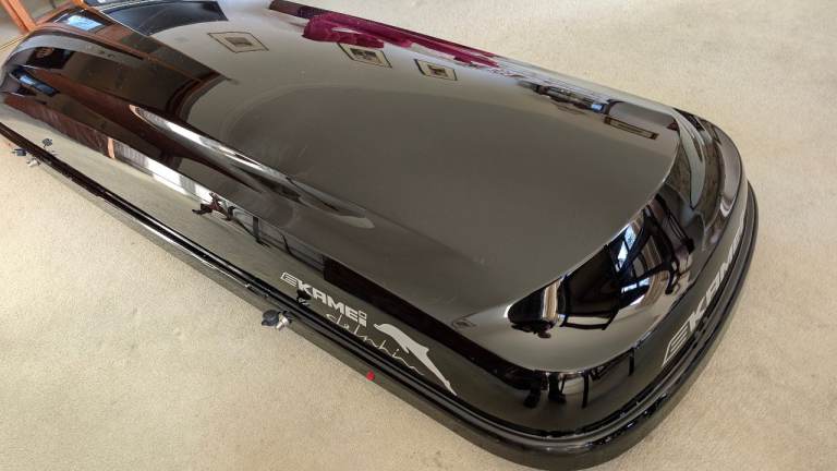 KAMEI Delphin 470 gloss black. German-engineered, secure, and spacious. High-quality, aerodynamic roofbox. Ready to fit and use immediately.