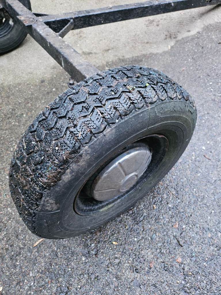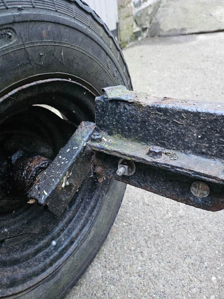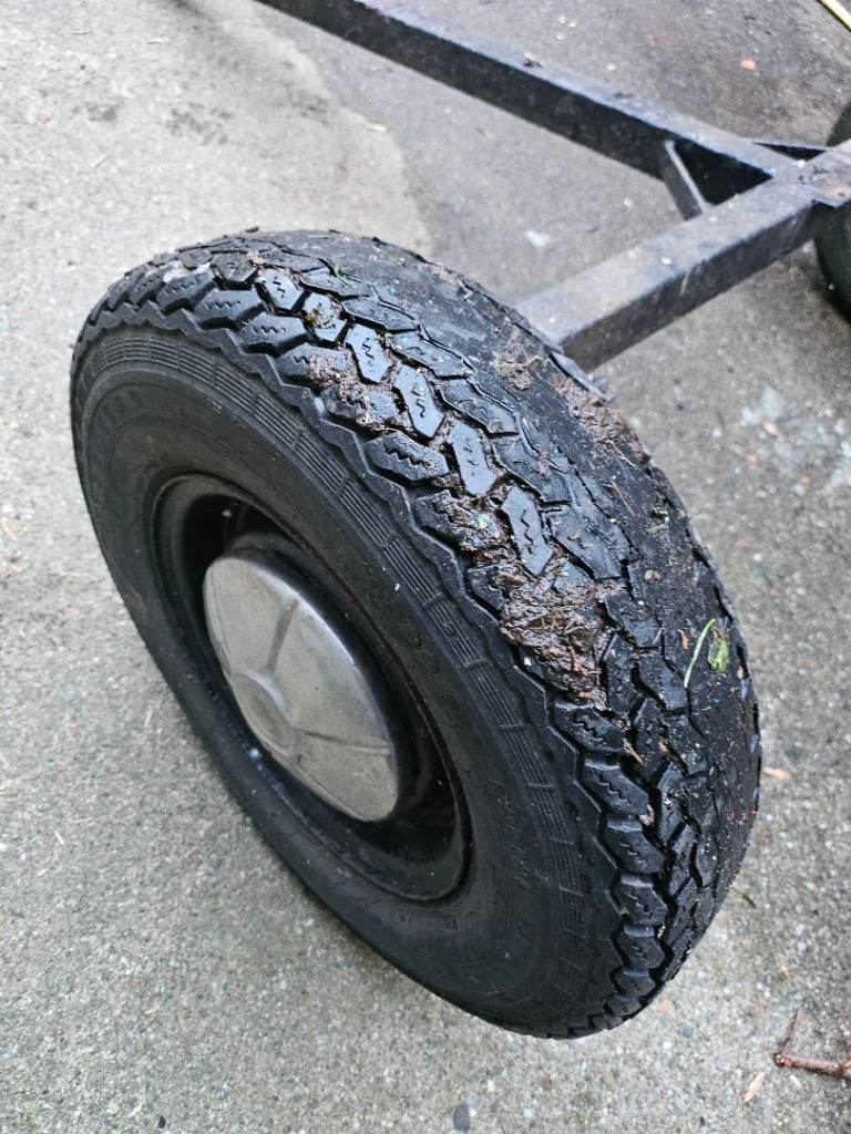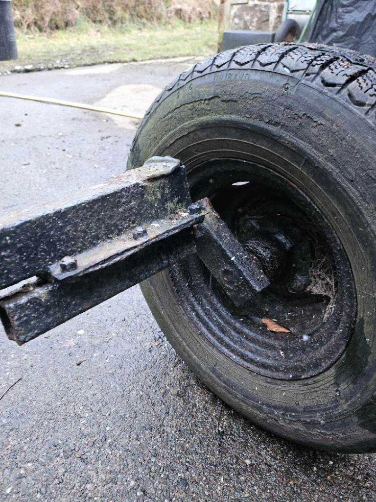 Best suited to an off-road project. It has been used until recently as a water bowser, with an IBC bolted onto it. It's old, and very rough, but pretty sturdy. Tyres hold air, but there's not much tread on them. Bearings run smoothly.