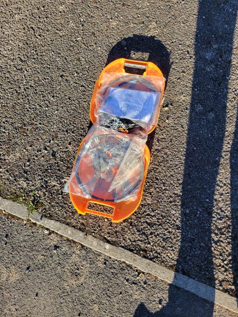 Never been used. Easy fit snow chains for most car tyres up to R18 (for tyre size ranges see photo 3). Storage box contains 2 sets of chains in bags with fitting instructions.