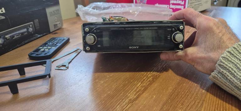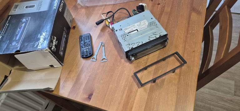 Retro car stereo head. Complete kit, flip down facia, colour screen head unit, surround, connecting wires, remote, removal pins. Great unit for any in car entertainment build. Easy fit for older cars before built ins. Open to offers
