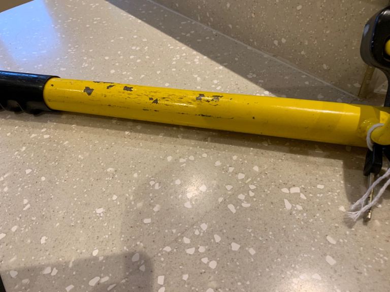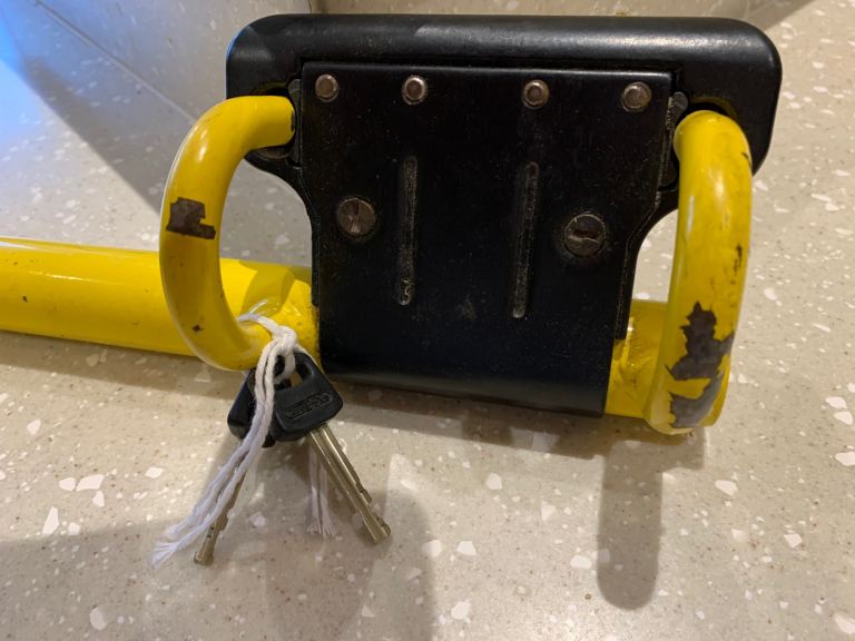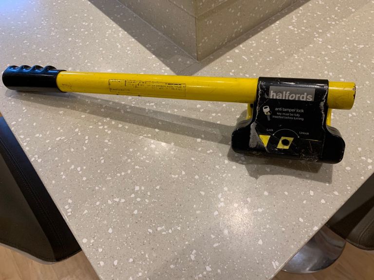A Halford’s steering wheel lock. Includes the keys. It is in good working order. There are many scratches from wear & tear.