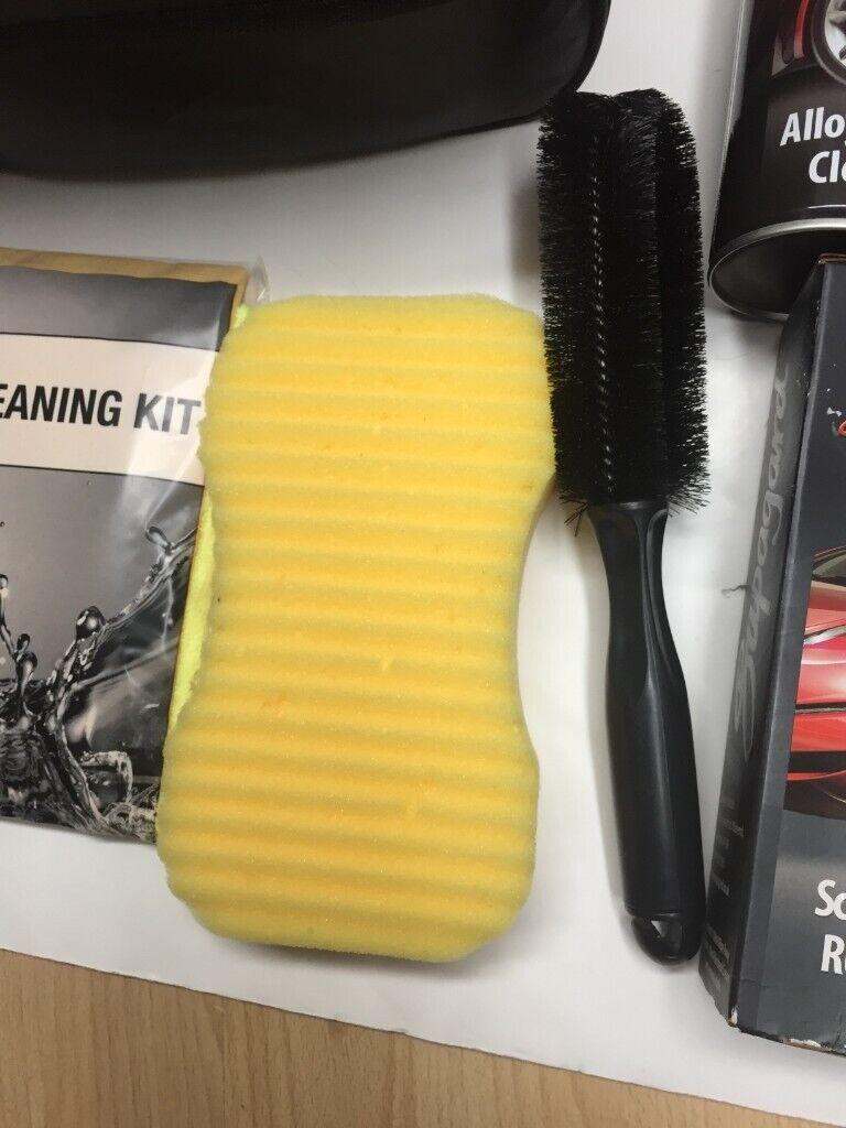 Scuff Mark Remover, pH Neutral Shampoo, Alloy Wheel Protector & Cleaner, Tyre & Trim Dressing, Sponge, Brush & Cloth.