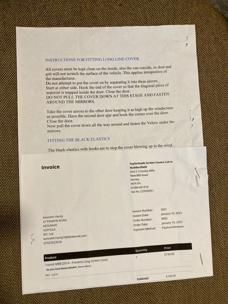 Long Line Silver Screen Cover to fit Autotrail Ford Transit Cab.