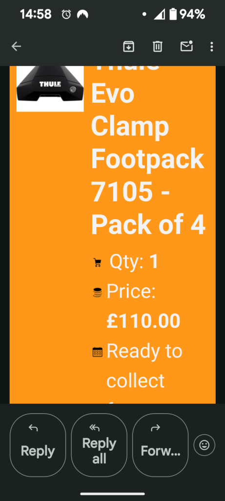 Changed , car , these don't go on new car. Thule Evo wing , with fitting kits and clamps. £270 worth..3 months old. Receipt in pics. £120 takes it.