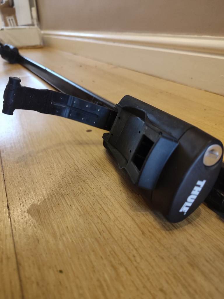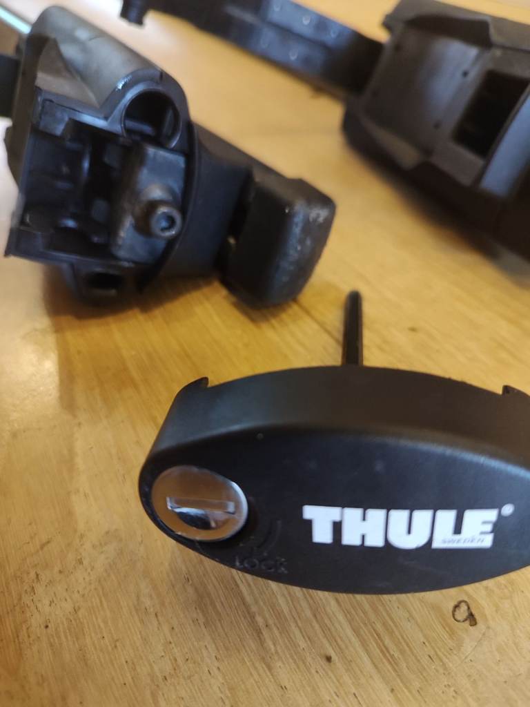 Thule Roof bars. For cars with a raised railing rack. Includes feet, locks (with key), and Thule square bars (128cm long) . I had it fitted on a Skoda Kodiaq but I believe they are universal for any raised railing rack as you use the built in Allen keys to adjust the feet to the rack. Collection only.