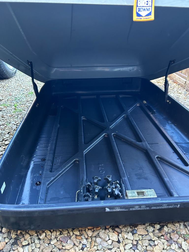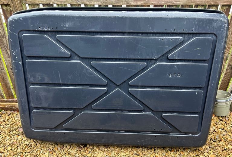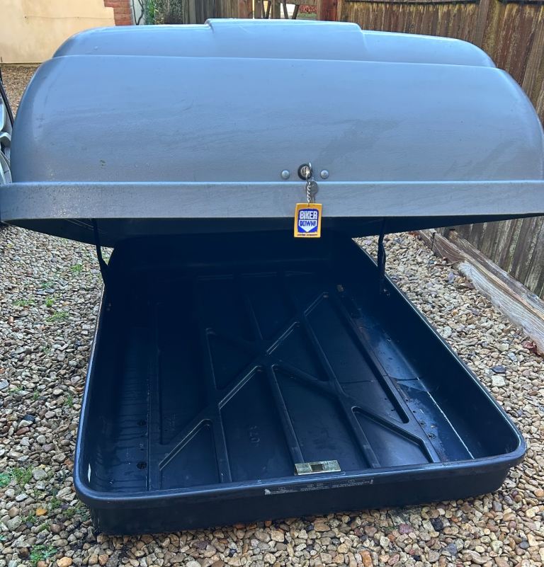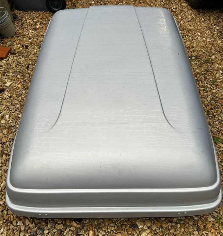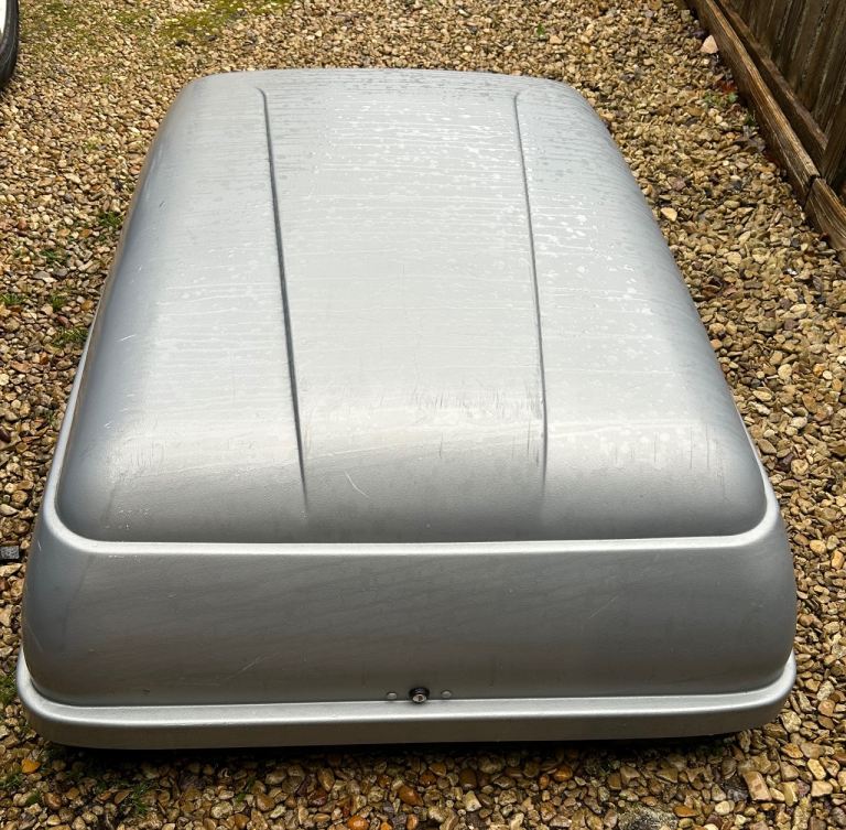 Sturdy roof box with fixings. Hinges at the front. 50kg max load. Very good condition overall though has some minor marks - see photo. Dimensions 135 cm long x 95 cm wide x 45 cm high. Comes with 2 keys.