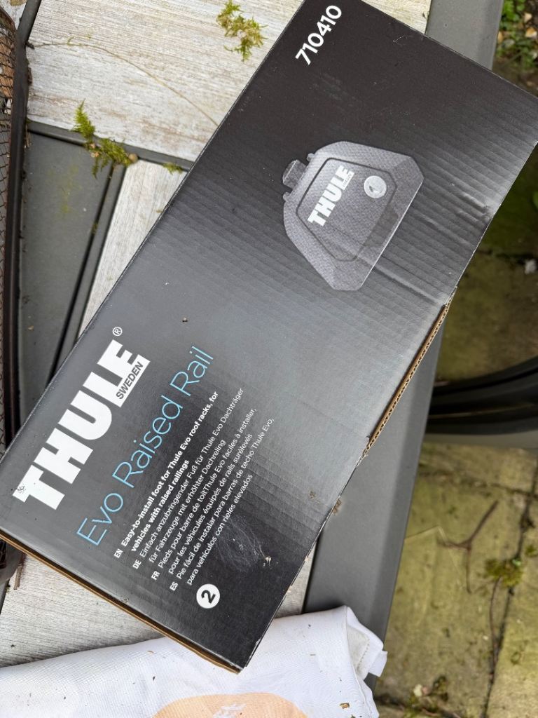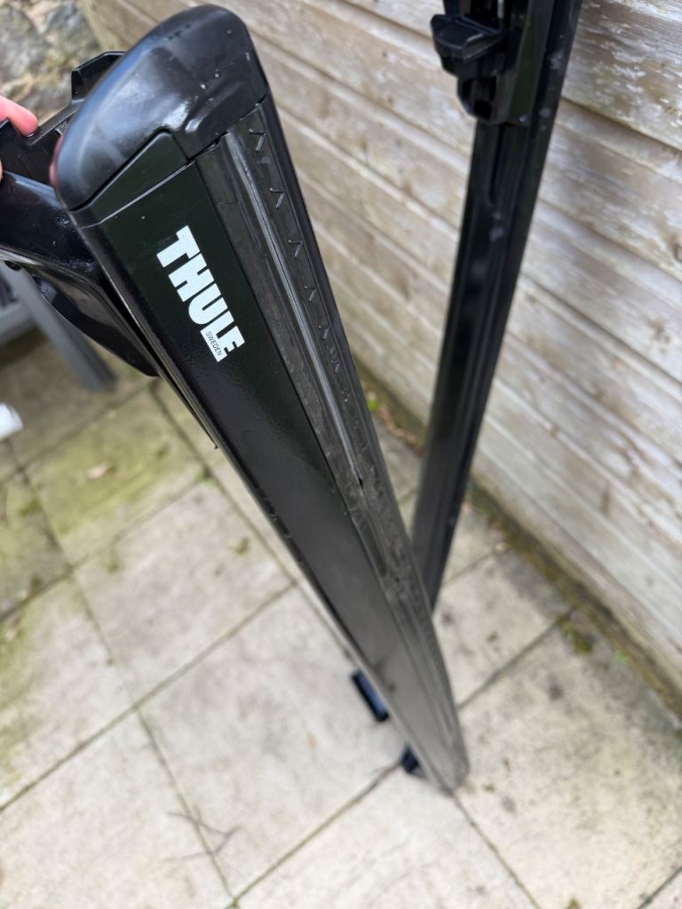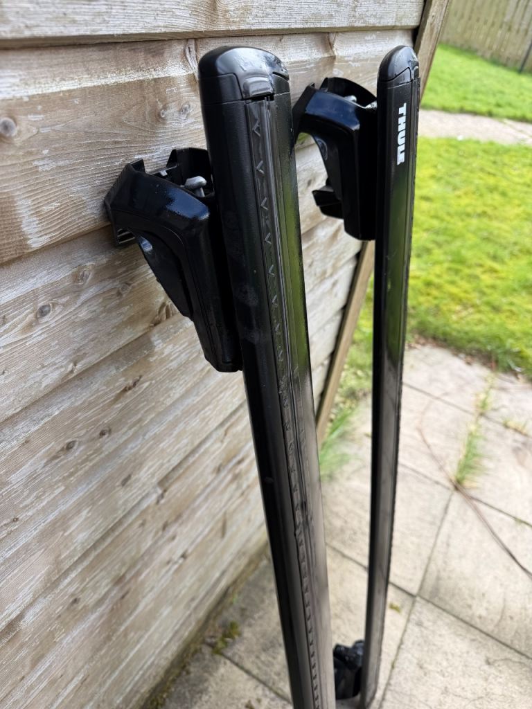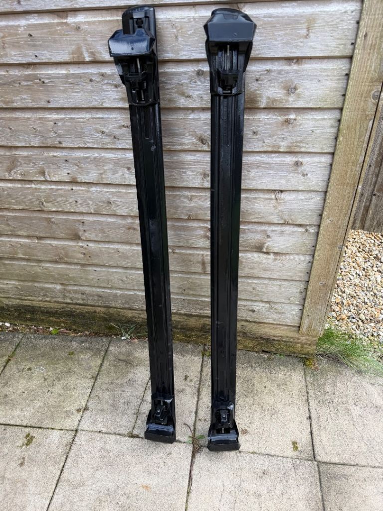 Thule WingBar Evo roof rack bars in black, supplied with the Thule Evo Raised Rail kit (710410). Great quality Thule system and in good condition.
