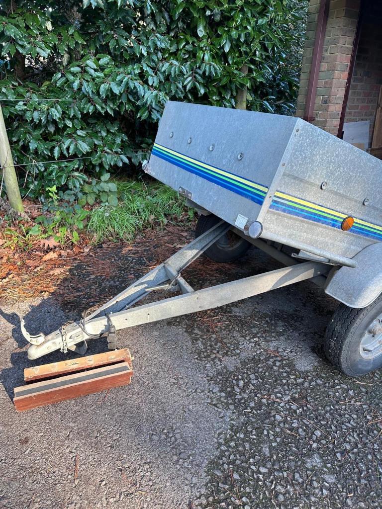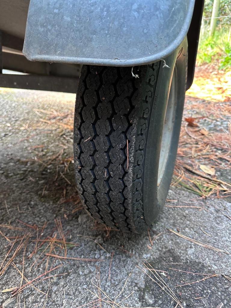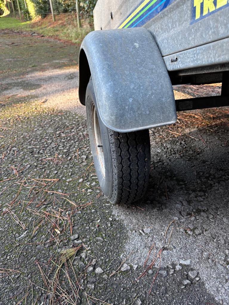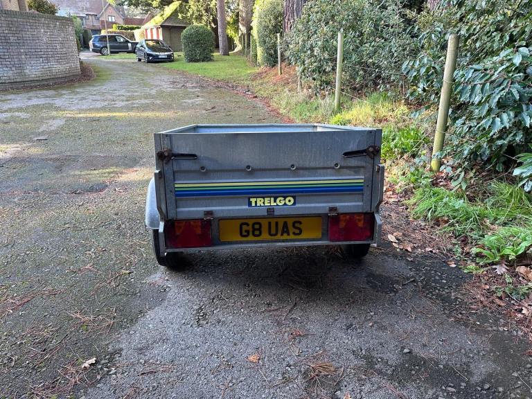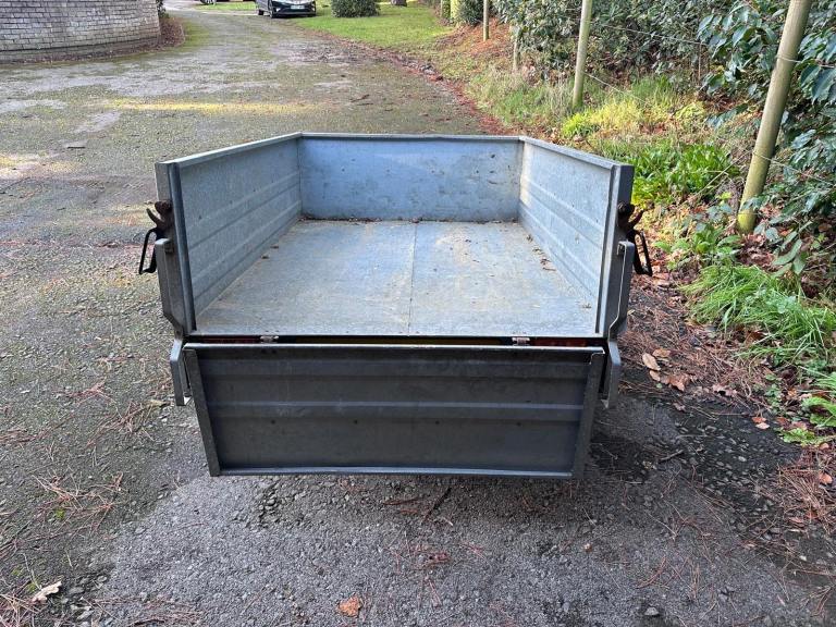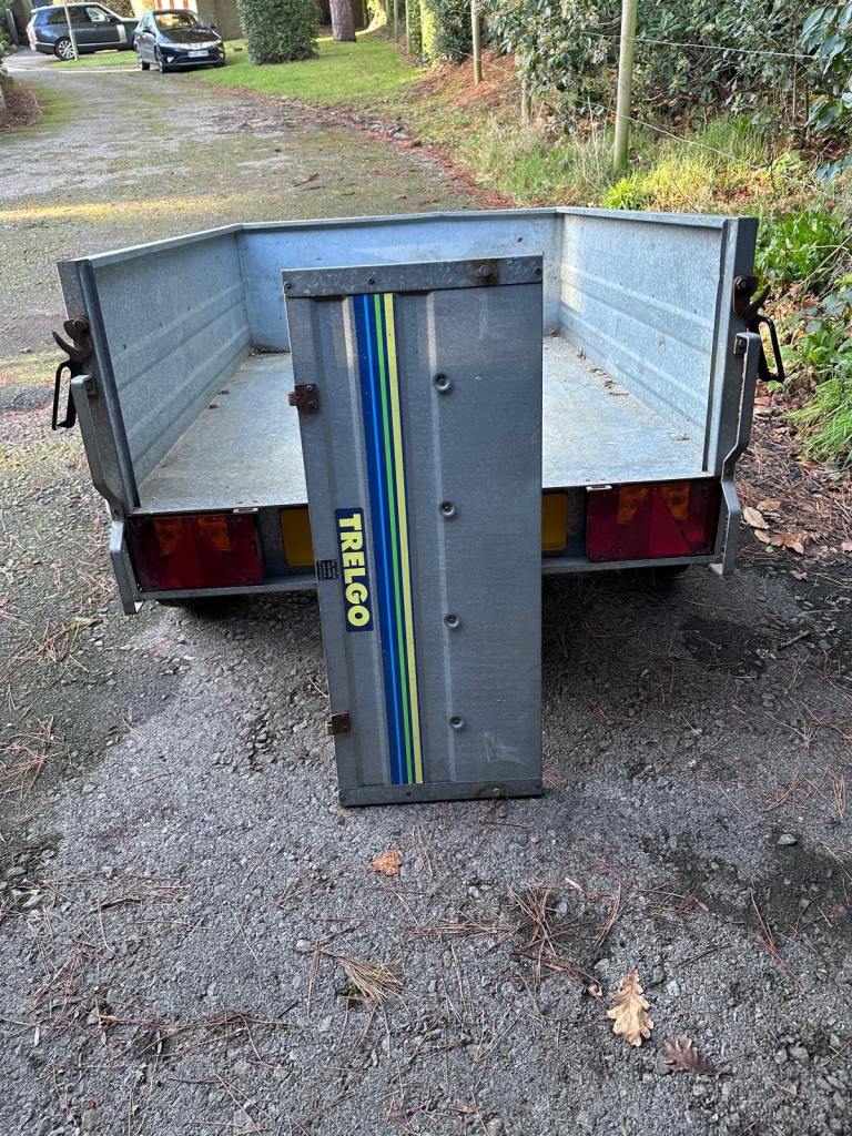 Trelgo tipping trailer with removable tailgate. Tipping action. Two good tyres. Slight damage to near side light cluster.