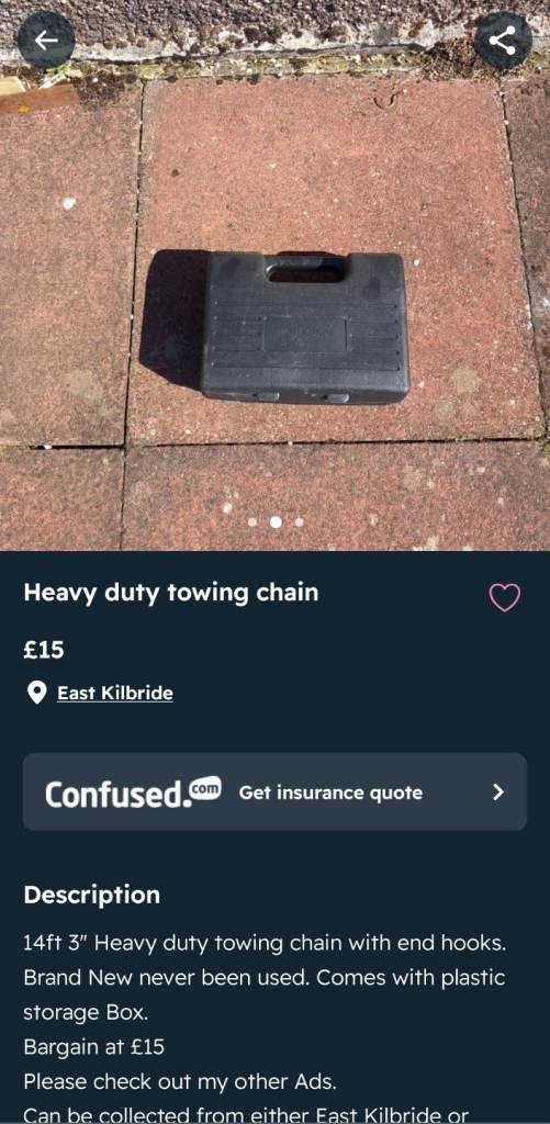 14ft 3" Heavy duty towing chain with end hooks. Brand New never been used. Comes with plastic storage Box.