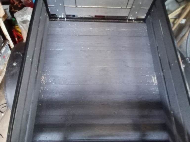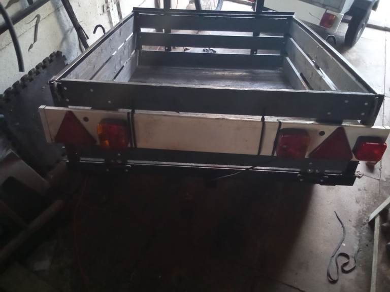 Small 4ft by 5ft trailer in good solid condition. Metal frame with a wooden floor, sides and drop-down tailgate. All lights working. Tyres are in a good condition. Ideal for garden waste, DIY, or general use. lightweight and easy to tow. Include a 7-pin plug.