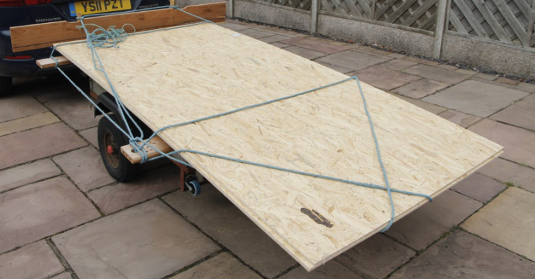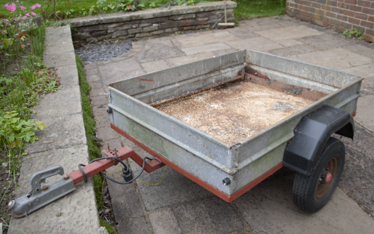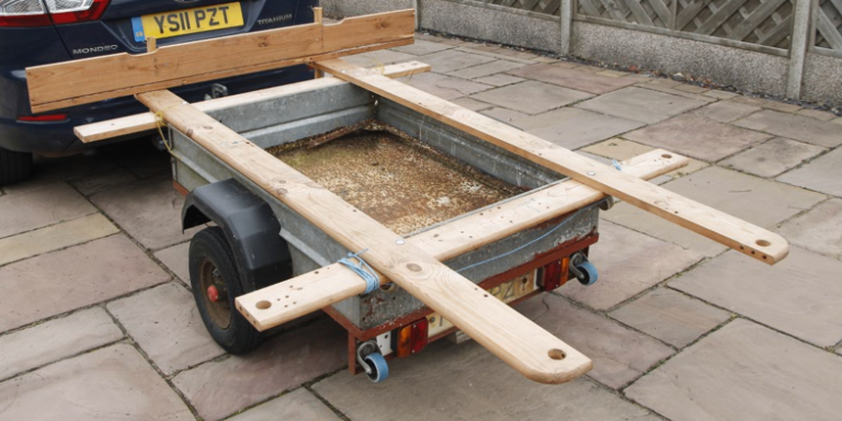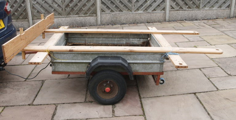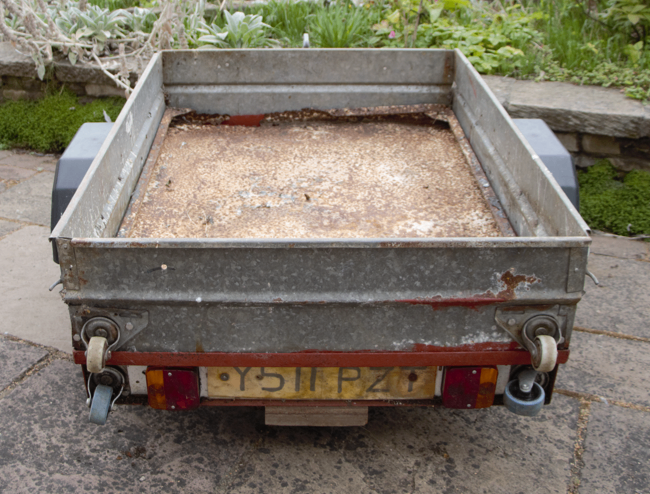 4 foot by 3 foot car trailer. Includes attachable frame for carrying 8x4 sheet material. Well used but in workable condition.