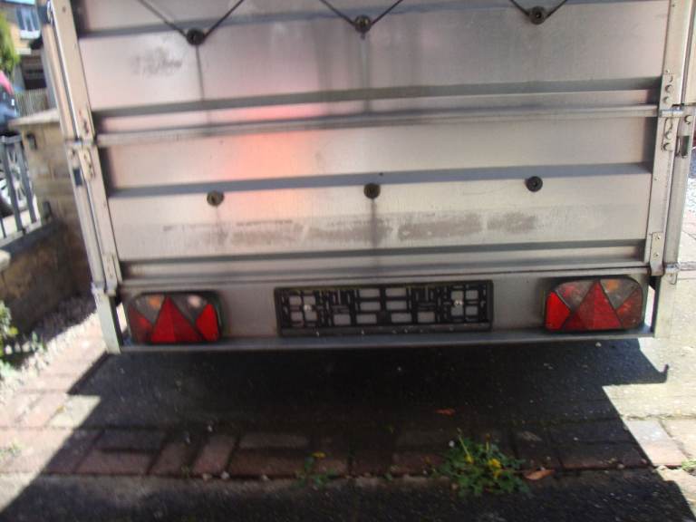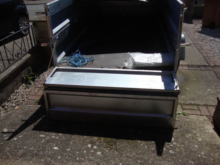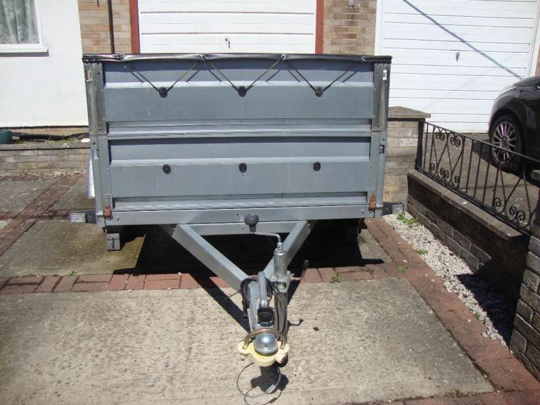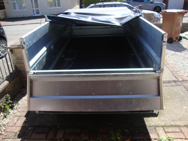 Hardly used lightweight twin axel trailer, ideal for camping, car boot and light transport. New spare cover. 3725mm long x 1840mm wide. Sides are removable. Excellent to tow. Very good condition.