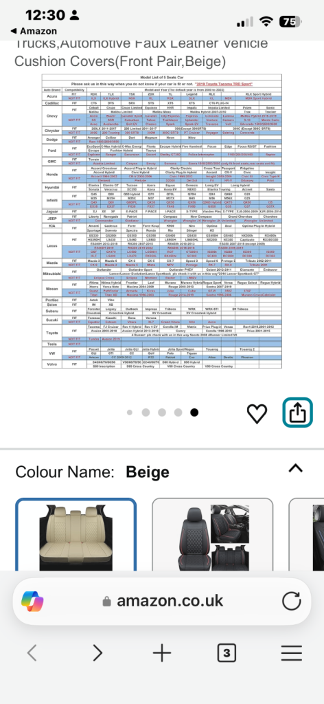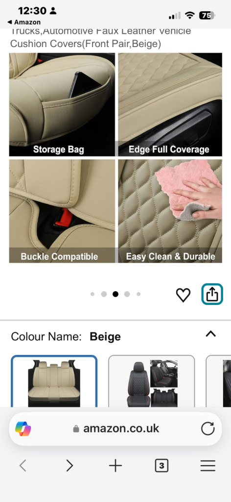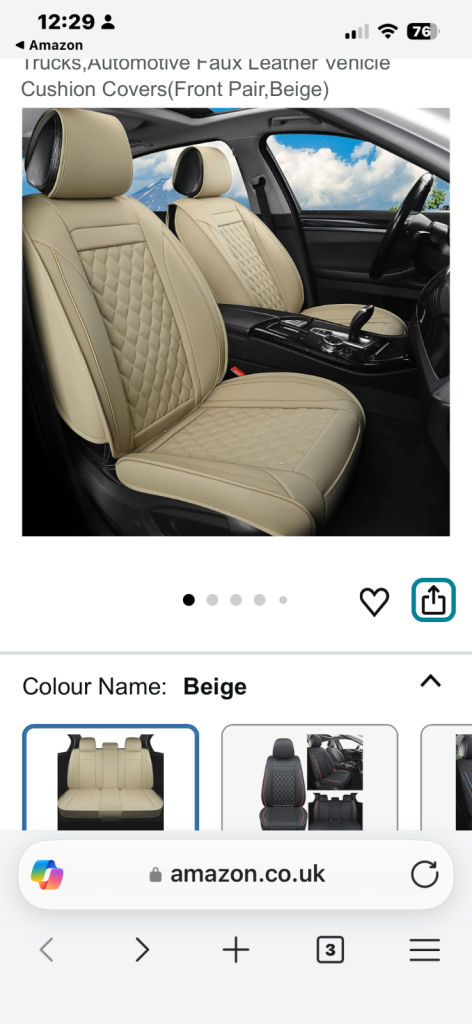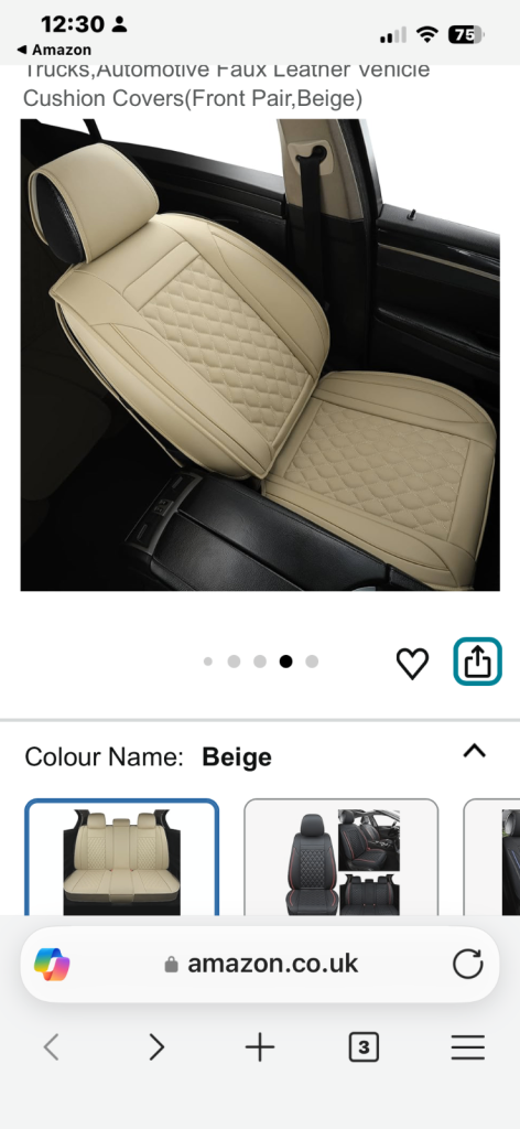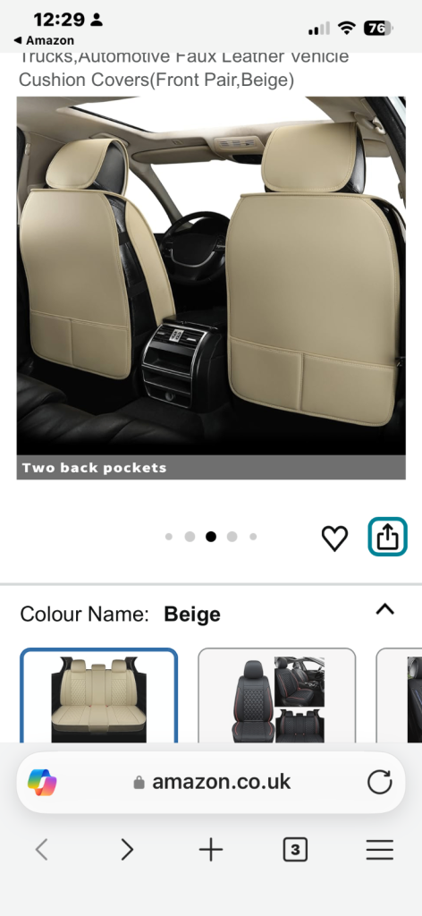 Lovely well made Faux Leather seat covers for sale. Only used for a short period of time. Still for sale on Amazon for £119.99.