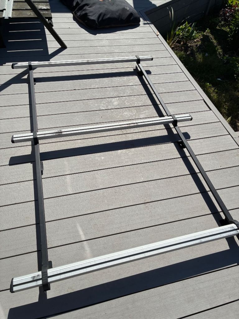 Three bar system the two front bars connect to van rear bar floats/rests on roof