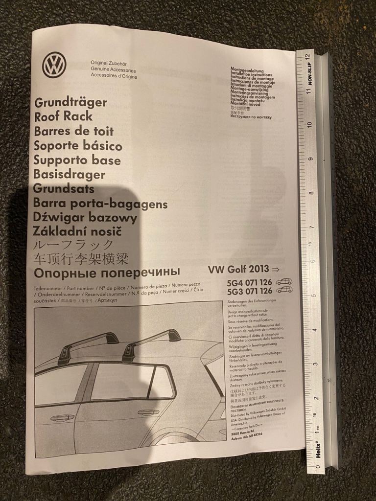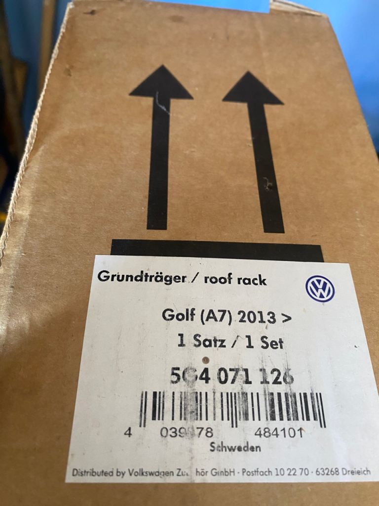 Unused roof rack for VW Golf 2013 onward, lockable fixings, instructions and in original box. Increases capacity for bikes/ kayaks/ cargo boxes etc and designed specifically for VW Golf, with low profile, good quality and secure fit.