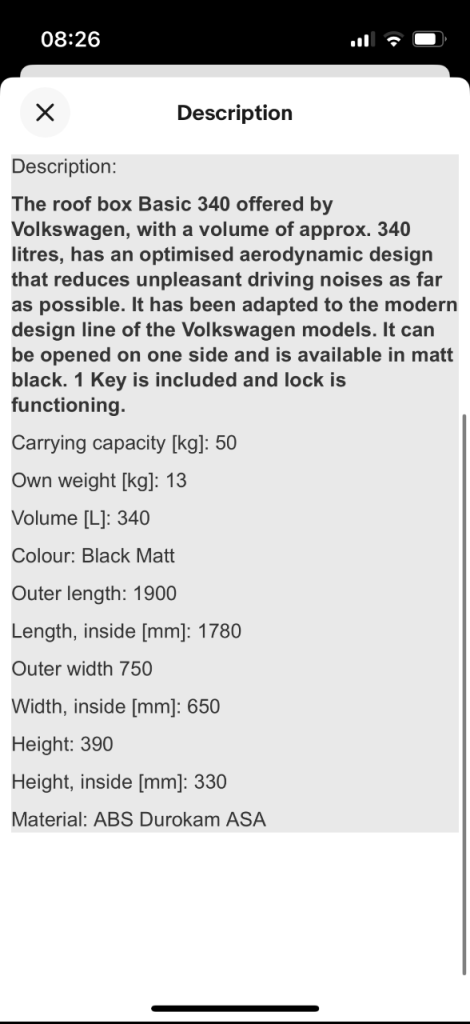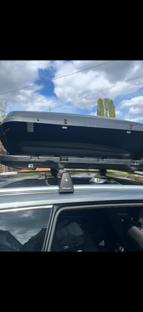 VW black 340 litre roof box genuine part used 3 times. Excellent condition