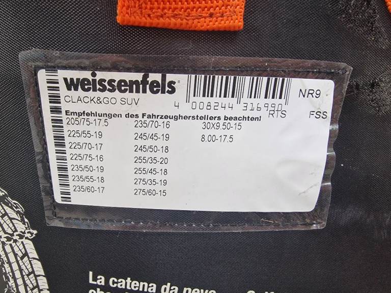 New, Never used , Self tightening snow chains. Weissenfels clack and go NR9