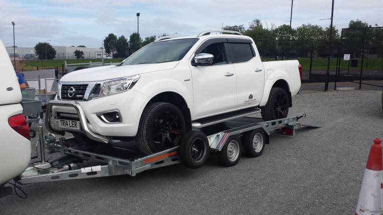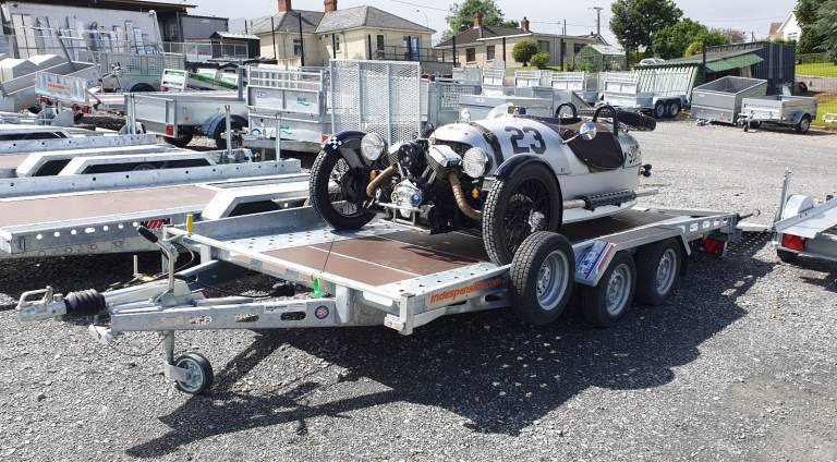 6'4'' wide, 2.7ton gross trailer, pull out ramps with rear prop stands, spare wheel.
