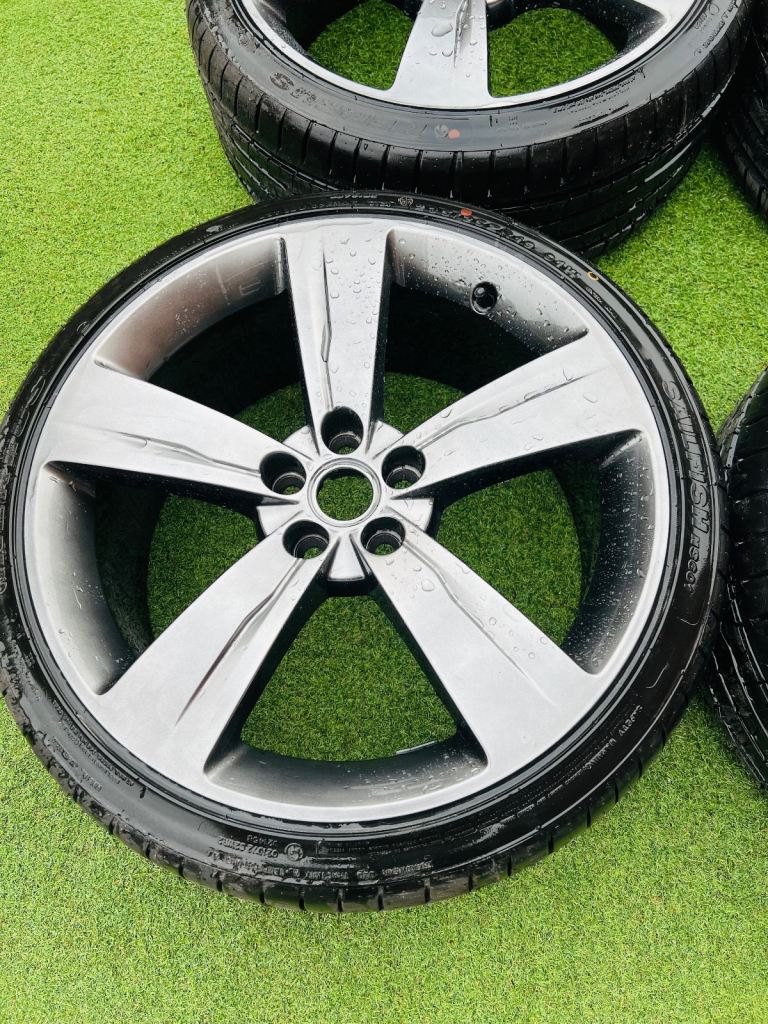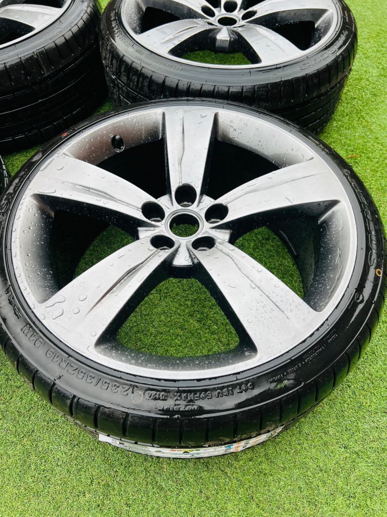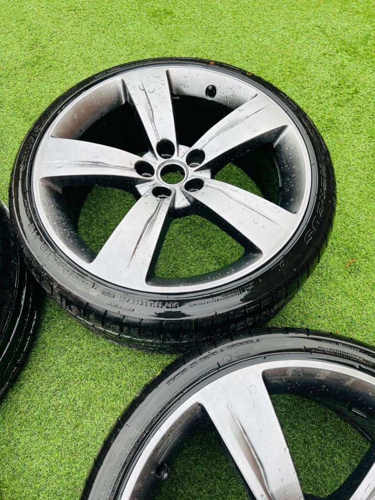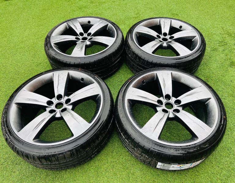 Freshly Powdercoated in stunning Shadow Chrome. 19” Alloys. No buckles welds or cracks. Fresh set of mid range 235x35x19 tyres. New valves, inflated and balanced- ready to go. Will fit a range of 5x108 manufacturers Including Ford Volvo Jaguar.