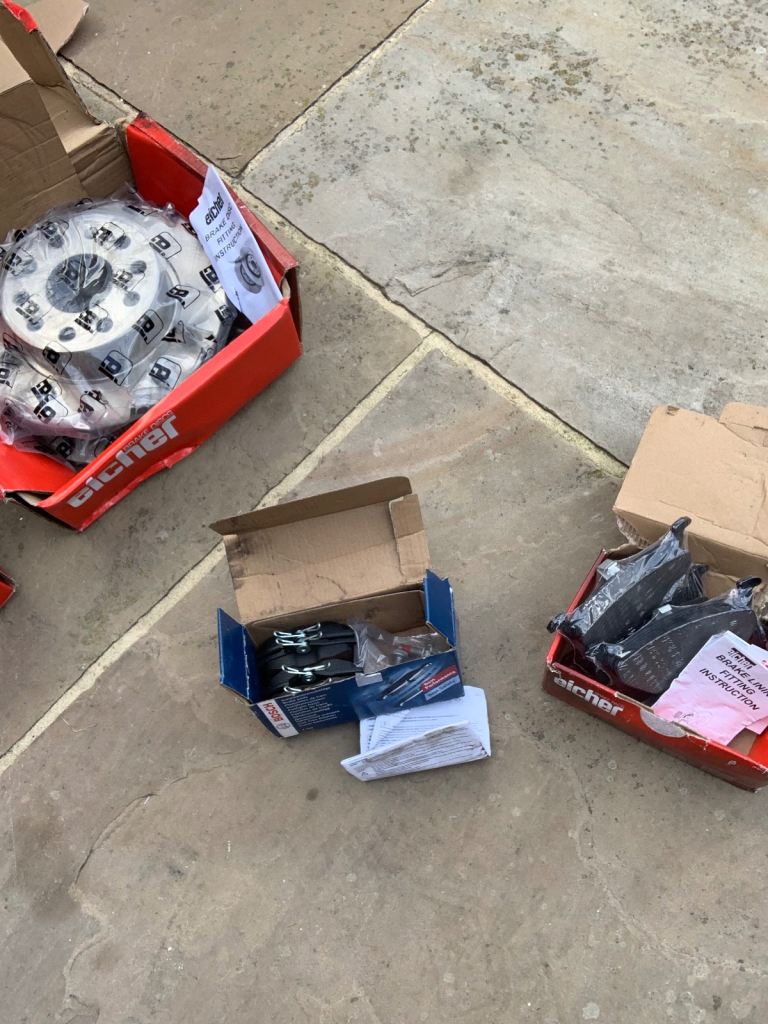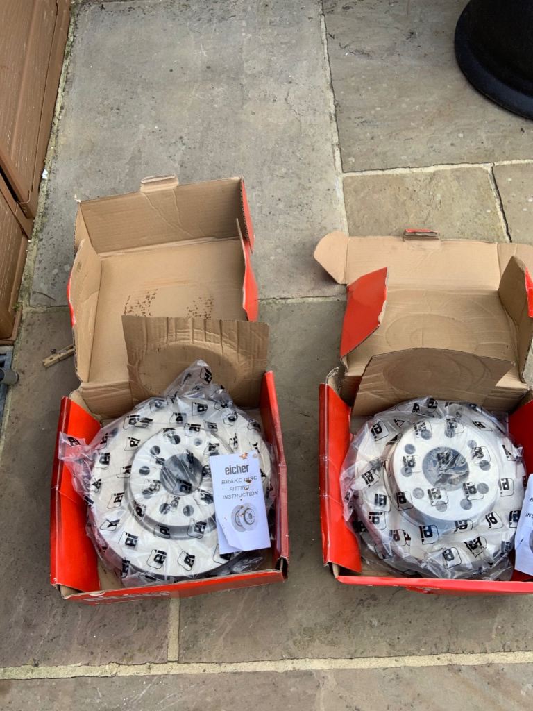 Front and back. Discks and pads. Brand new. Thay don’t fit my car One disk has a bit off surface rust due to opening the bag when bought. Realising that were the ring size.