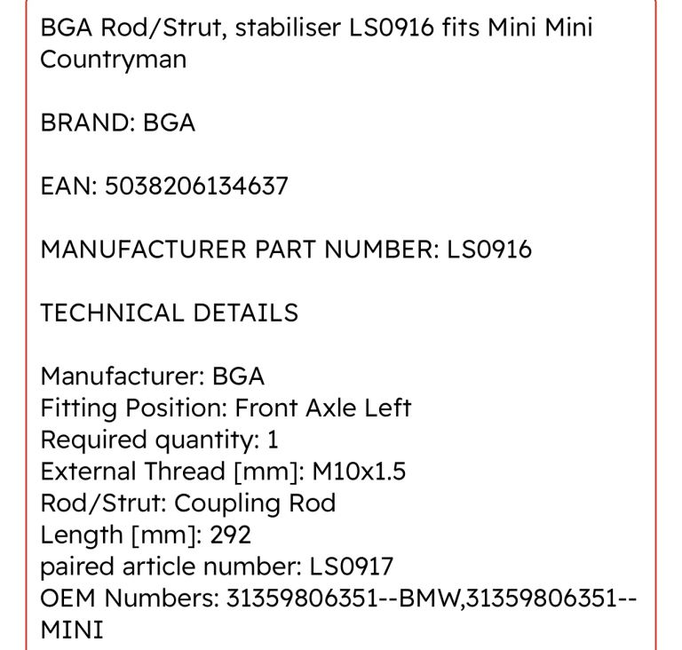 Posting for 10+ yearsBGA Rod/Strut, stabiliser LS0916 fits Mini Mini Countryman