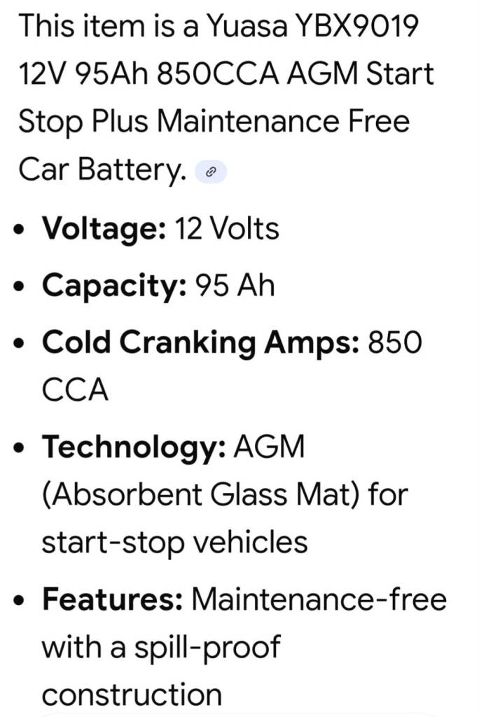 BMW 520D, AS NEW YUASA, AGM STOP START CAR BATTERY.