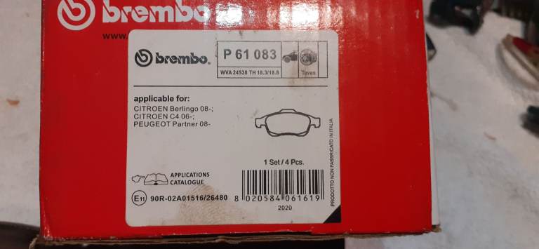 brand new BREMBO front pads for a 2010 onwards Peugeot or citroen Berlingo. Sizes and codes in photos.