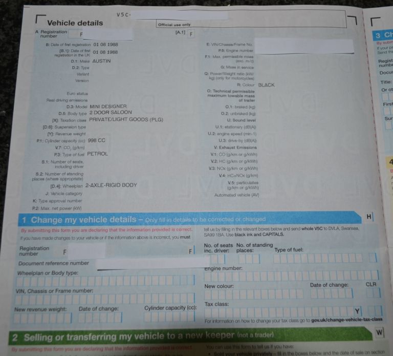 The V5c confirms this is a Mini limited edition Designer with a 998cc engine and manual transmission.